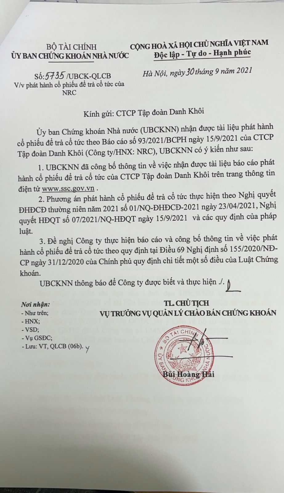 Công văn số 5737/UBCK-QLCB: Về việc phát hành cổ phiếu để trả cổ tức của NRC