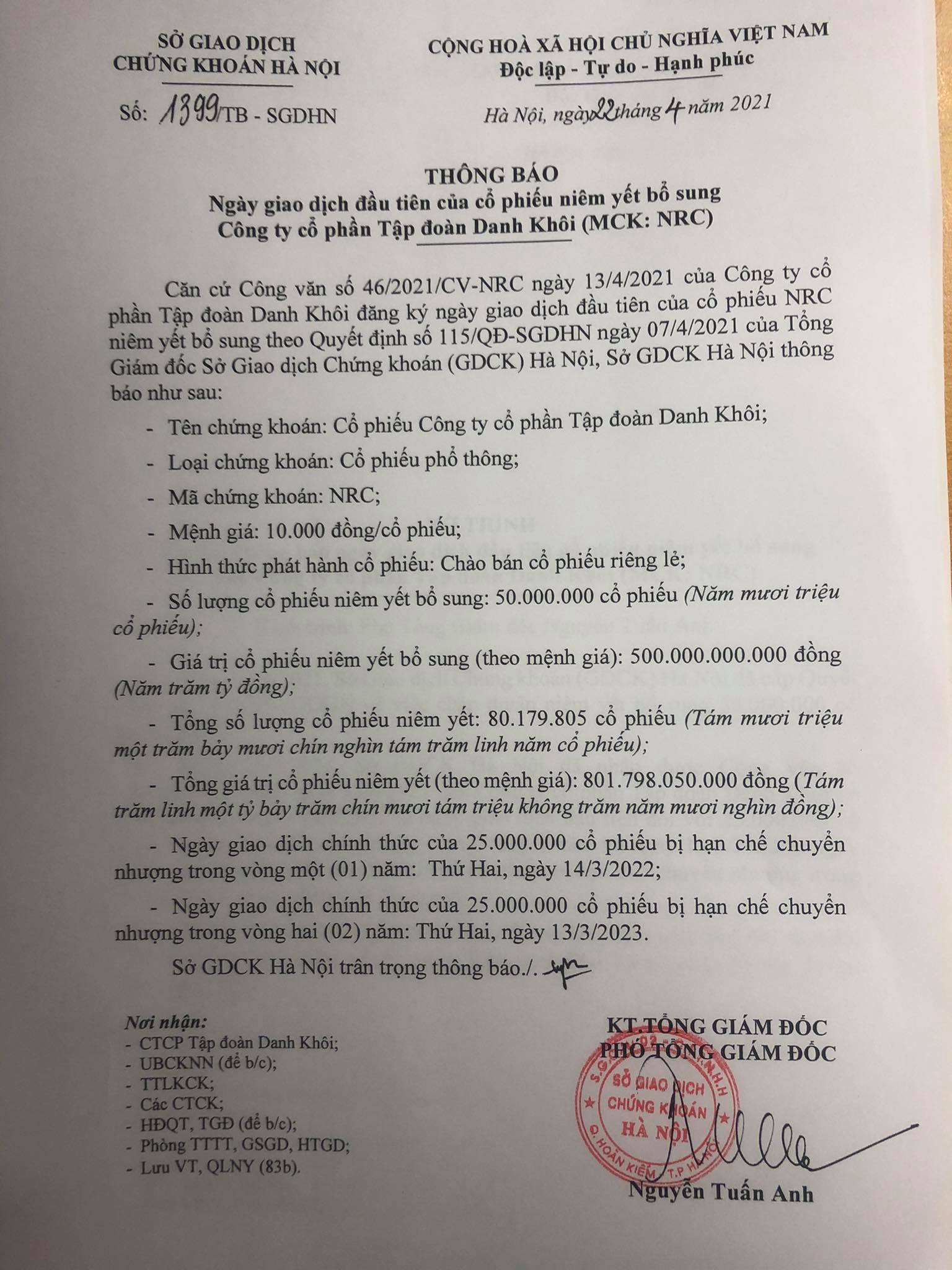 Thông báo số 1399/TB-SGDHN: Ngày giao dịch đầu tiên của cổ phiếu niêm yết sổ sung Công ty cổ phần tập đoàn Danh Khôi (MCK: NRC)
